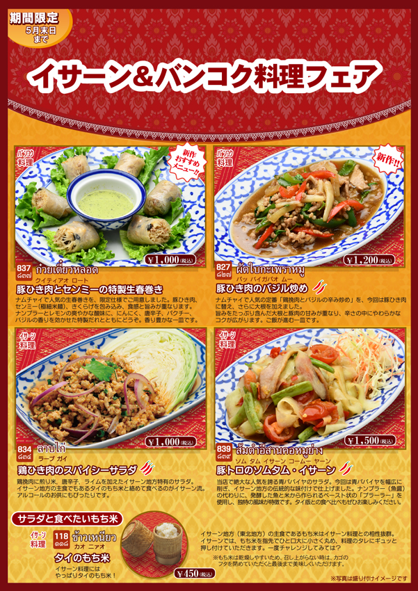 <<2026年3月1日〜2026年5月末日までのフェア>> 「イサーン&バンコク料理フェア」開催中です。 皆様のご来店をお待ちしております。